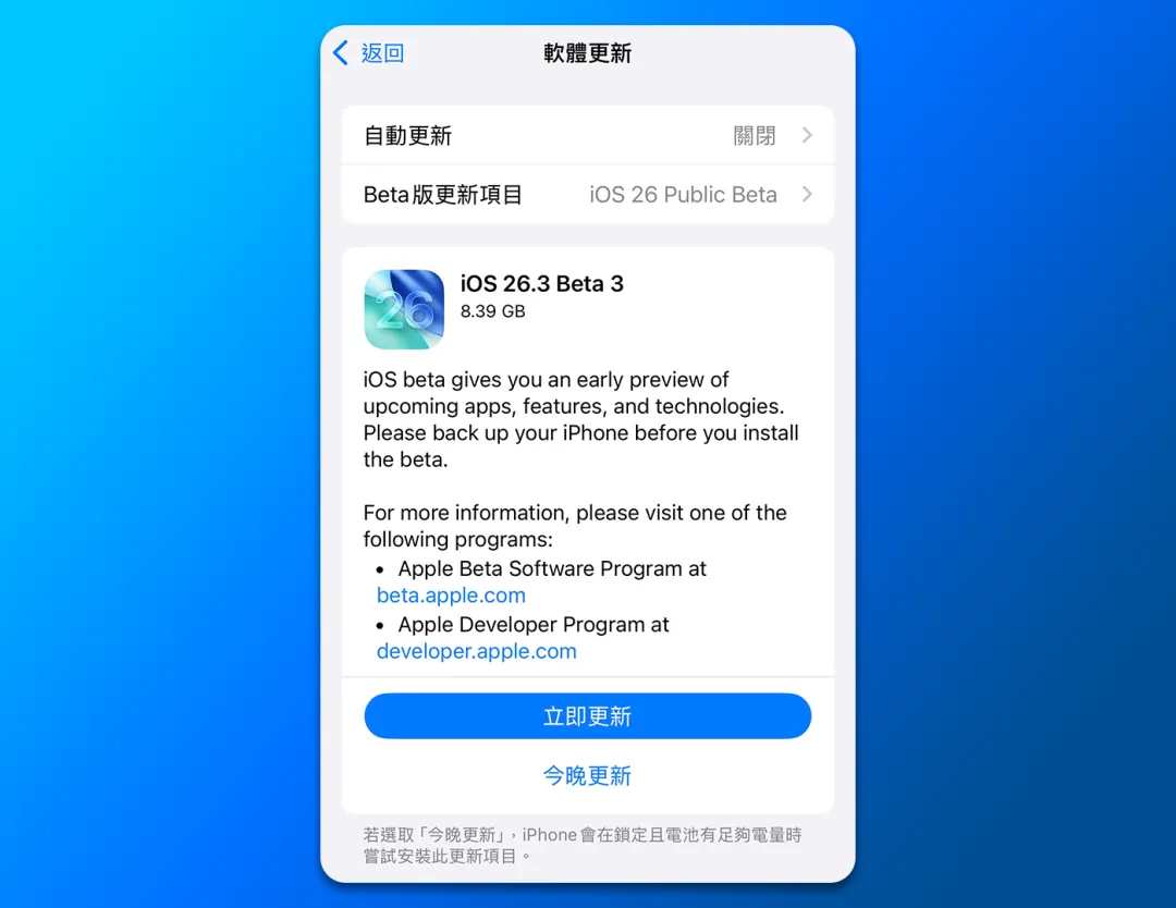 今天又迎来了 iOS 26.3 Beta 3 公开测试版系统。