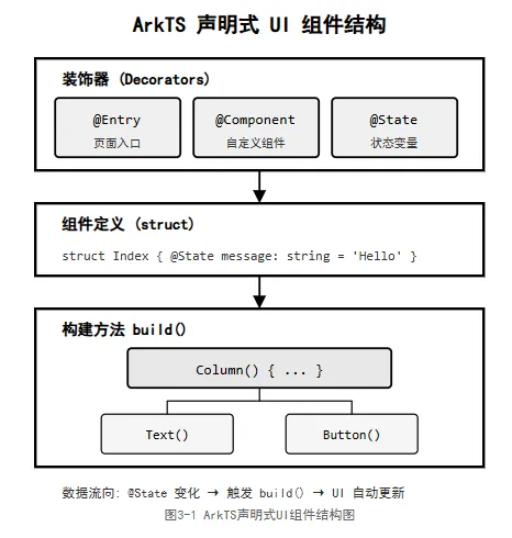 这段代码展示了ArkTS声明式UI的核心特性:@Entry装饰器标识该组件为页面入口,@Component表示自定义组件,@State标记的变量为状态变量,其变化会触发UI自动刷新。build()方法中使用声明式语法描述UI结构,通过链式调用配置组件属性和事件。