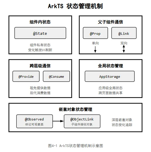 ArkTS提供了多维度的状态管理机制:@State用于组件内部状态,@Prop用于父子组件单向数据传递,@Link用于父子组件双向绑定,@Observed和@ObjectLink用于嵌套对象的状态管理。合理使用这些装饰器,可以构建清晰的数据流和高效的UI更新机制。