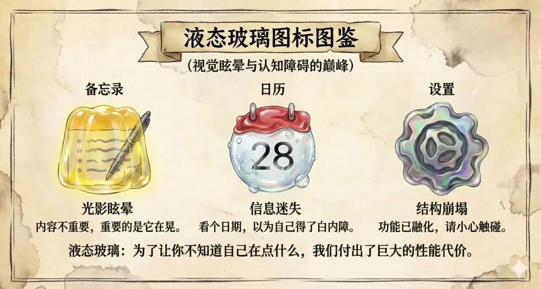 • 认知负荷爆炸: 当你想打开设置时,大脑得先穿过三层模拟折射层。这就像是在深夜的雨天,试图看清磨砂玻璃后的二维码。