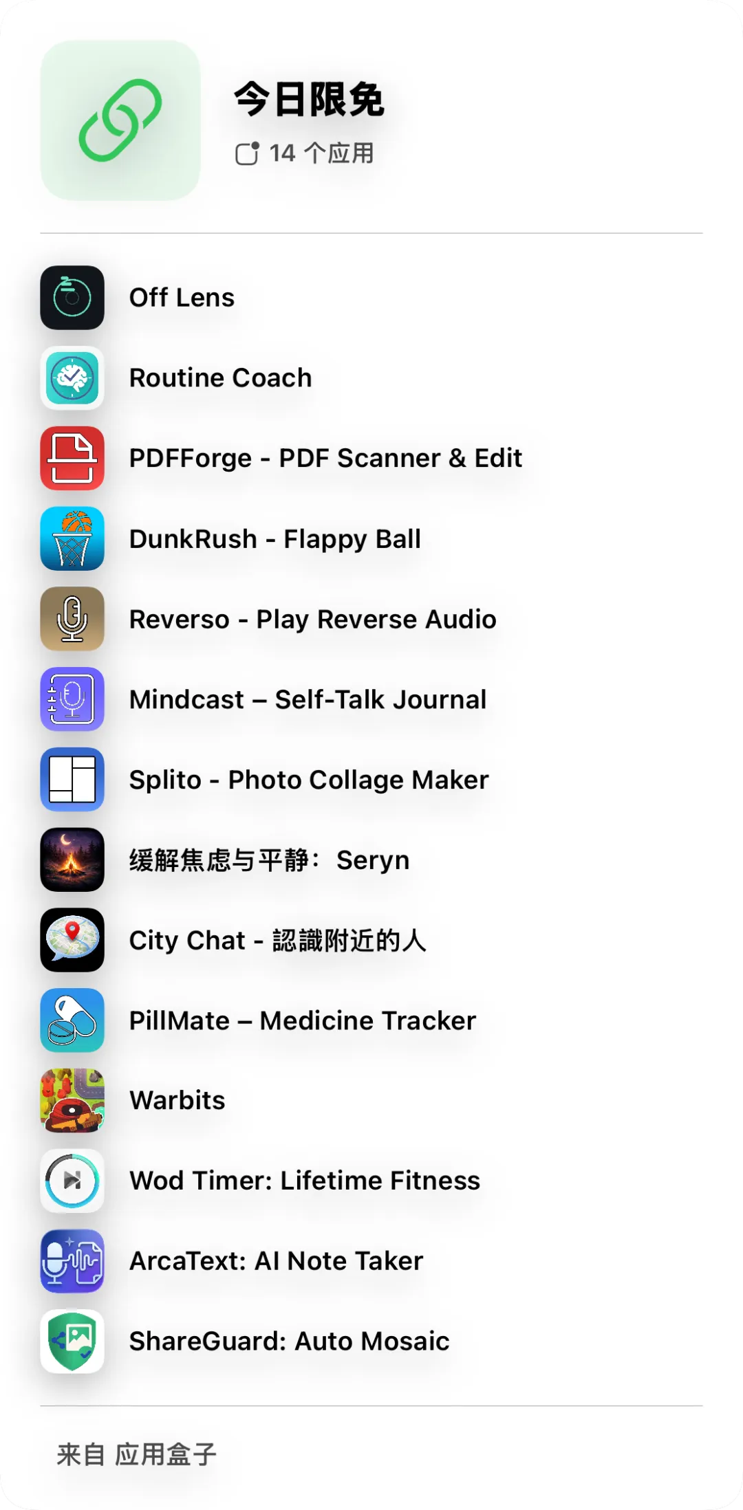 App限免是开发者设置的限时优惠活动,限免随时可能结束,请及时获取!获取时请注意看好本体限免的App是否已收费,内购限免的App的内购页面是否有显示¥0.00。确认还在限免再下载获取,避免意外扣费!可以翻看往期限免,也许还能捡漏~
