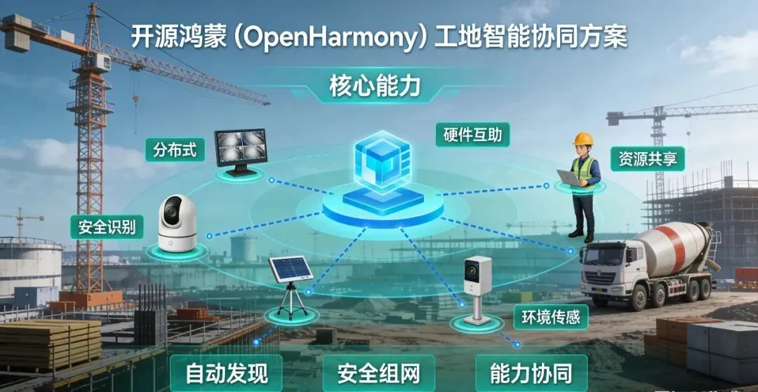 开源鸿蒙(OpenHarmony)操作系统的出现,为解决行业根本性难题提供了全新的底层架构。其核心的“分布式、硬件互助、资源共享”能力,使各类智能设备能够像智能终端连接配件一样,实现自动发现、安全组网与能力协同。这为构建真正互联互通、敏捷响应的智慧工地,提供了自主可控的“数字神经系统”。