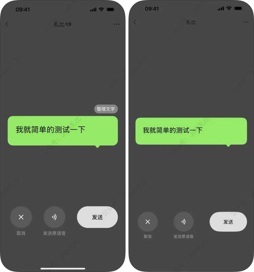 扎比发现,在聊天界面中录制语音后,点击「滑到这里 转文字」。绿色大气泡的整理文字按钮和相关的提示都没了。可能是测试版的BUG?
