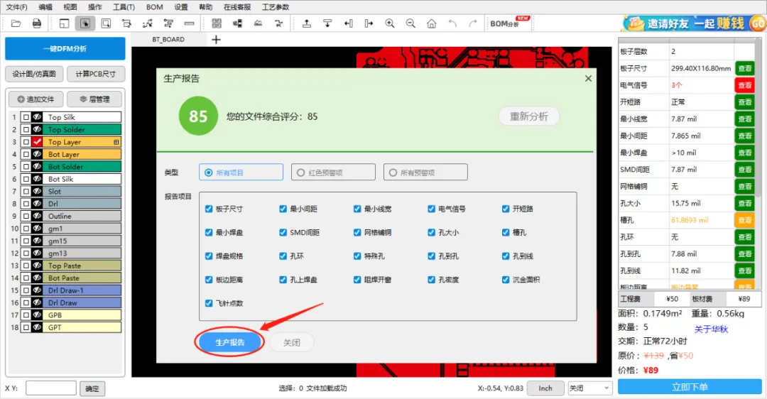 打开PCB文件后,点击左上角的“一键DFM分析”,右边就有潜在隐患的提示。