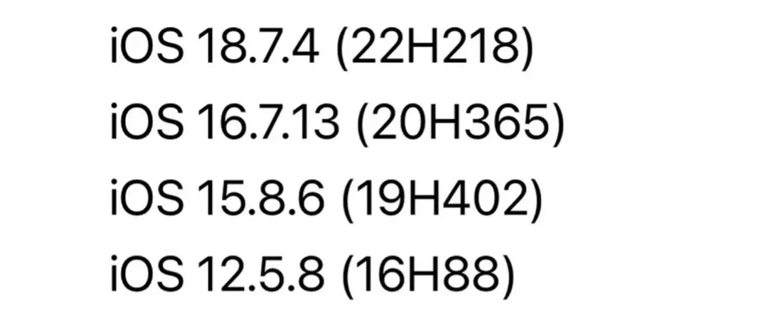 主要涉及 iOS 18.7.4、iOS 16.7.13、iOS 15.8.6 和 iOS 12.5.8 四个版本,停止签名这些更新包,防止更多果粉们因升级陷入断网困境。