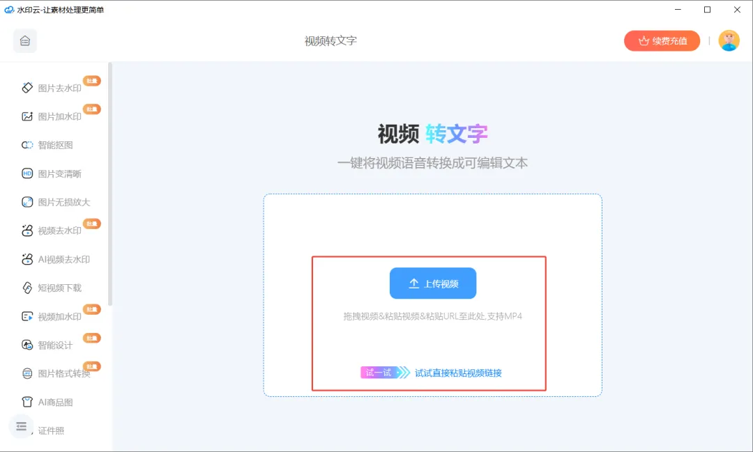 1、打开水印云客户端,进入 “视频转文字” 模块,点击 “上传视频”;