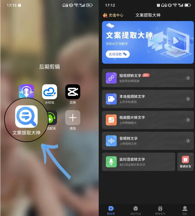 提取本地视频文案:选 “视频转文字”,从手机相册导入视频,等待识别;