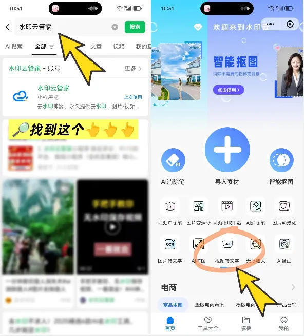 如果临时需要转文字,不想下载软件或 APP,微信小程序 “水印云管家” 就是最佳选择,即用即走,免费无套路,适合应急场景。