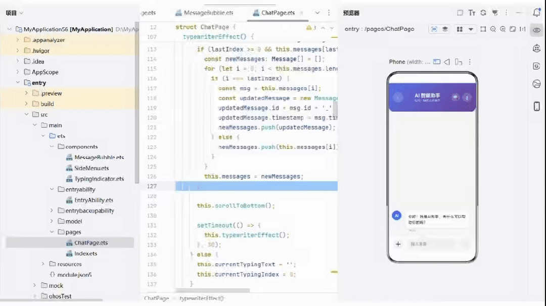 智能体在完成构建与修复动作以后,此时一个全新的鸿蒙AI聊天机器人应用就完成了,此时可以通过DevEco Studio自带的预览器实现聊天界面预览或通过智能体继续增加功能。