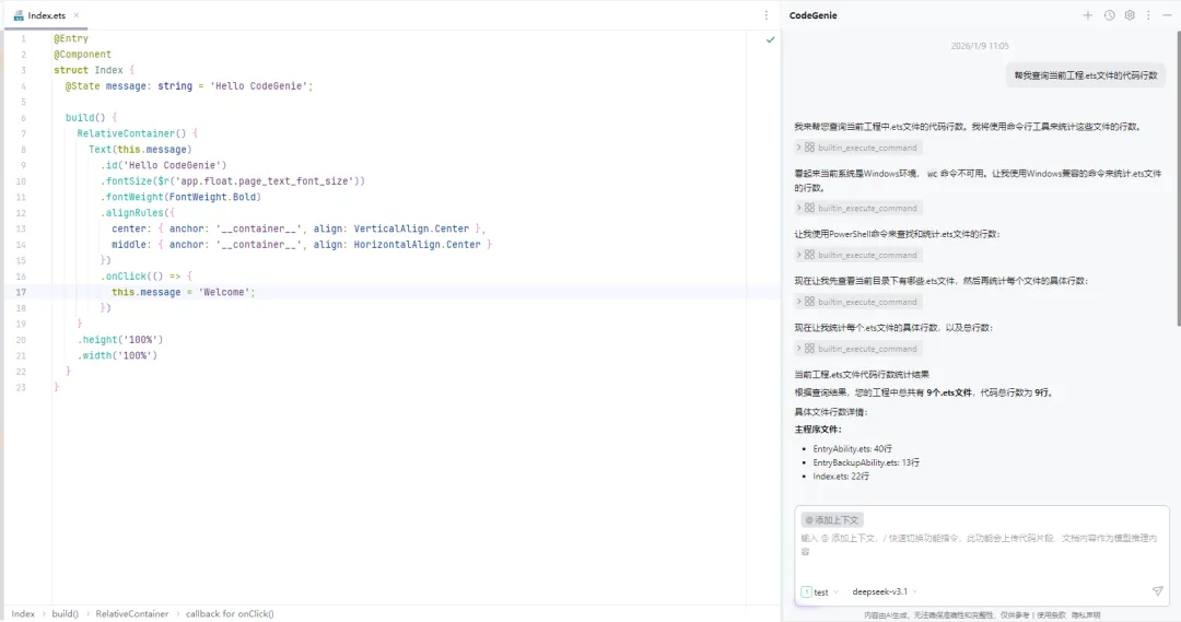 让我们通过一个完整的真实场景,看看 自定义智能体 @HarmonyMaster 是如何协同 CodeGenie 的核心能力完成开发任务的。