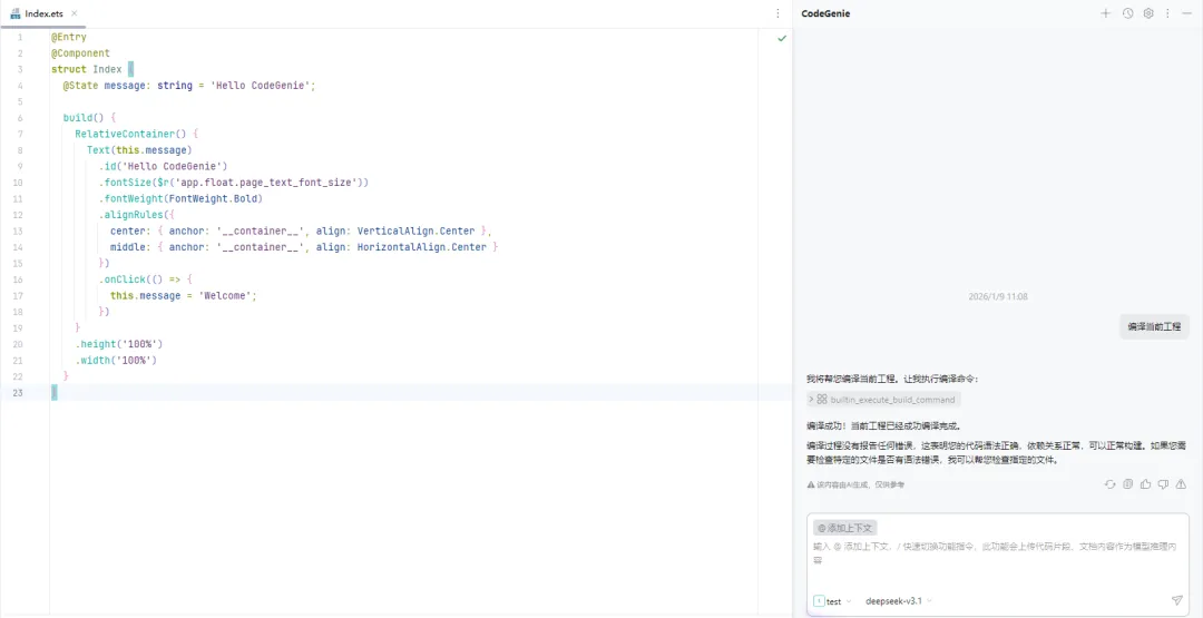 · 编译构建闭环: 自动执行 hvigorw assembleHap 等编译命令,如果报错会自动解析日志并修复,直到构建成功