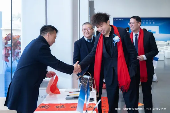 紧接着在热烈掌声中,鸿蒙智行智界用户中心・文治路店总经理赵恒、鸿蒙智行享界用户中心・文治路店总经理马丹,共同登台揭晓博行汽车集团精心准备的一幅题为“豫见鸿蒙,智启行远”的祝福卷轴。