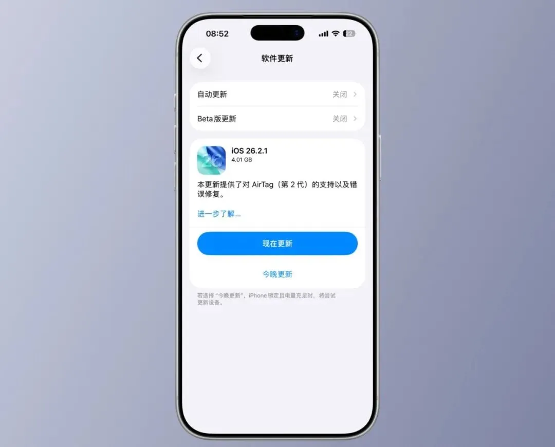 用户可通过设置-通用-软件更新路径在线升级,无需连接电脑。新款机型用户可放心升级iOS26.2.1,体验AirTag2适配功能;老机型用户建议优先升级,即便硬件性能有限,安全补丁也能保障日常使用安全。无需担心升级后卡顿,此次低版本更新仅优化漏洞,不会给老设备增加运行负担。
