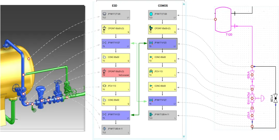 在工厂的PDMS/E3D 设计中,由于涉及到许多不同的专业和部门,特别是工艺专业与管道专业,工程师需经常的手工数据输入,数据变更,手动变更跟踪等大量耗时耗力的工作,随着工厂复杂度的日益增加,需要处理的数据量也越来越大,这种重复性的、毫无创新性的繁重工作加重了工程师的工作压力。而 COMOS 一体化设计平台和 PDMS/E3D 之间具有交互式接口,所以能够确保安全双向导入/导出工程对象和工程数据。在 COMOS 和 PDMS/E3D 之间的轻松导航从而加快并简化了PDMS/E3D 用户的工作。