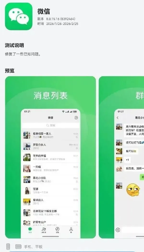 最近微信鸿蒙版又有新动作啦,在华为应用市场发布了 8.0.15.16(8392464)版本的邀测升级。