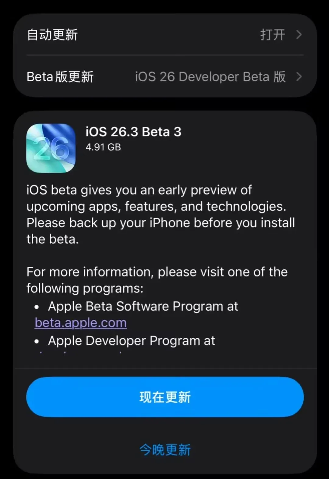 苹果向 iPhone 用户推送 iOS 26.3 开发者预览版 Beta 3 更新(内部版本号 23D5114d)。主要变化如下: