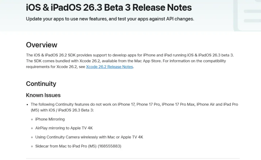 iOS 26.3 beta 3 内测出现问题了,根据苹果开发者文档说明,在部分设备上,多项“连续互通”相关功能暂时无法使用,包括: