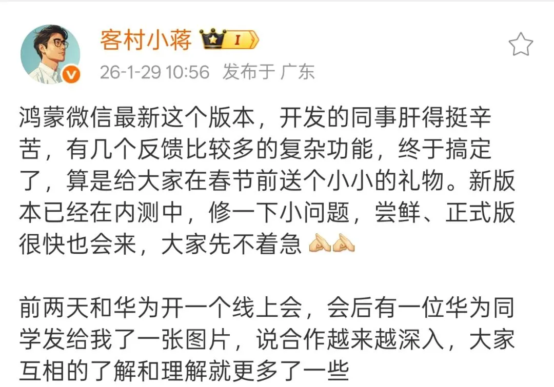微信员工@客村小蒋 透漏鸿蒙微信最新这个版本,反馈比较多的复杂功能终于搞定,春节前基本能完成正式版本的推送。