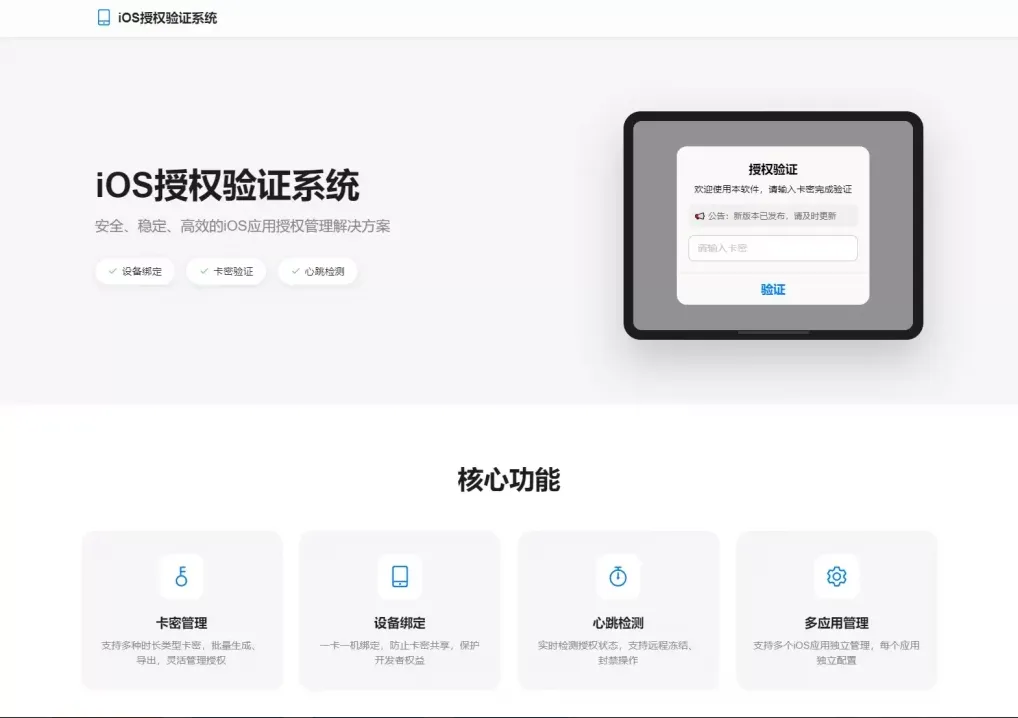 ◆ 码出精品 技造品质 ◆(十年沉淀全栈道,代码书写产品魂)这是一套完整的iOS插件授权验证解决方案,专为IOS网络验证开发者打造,部署到自己服务器,后台管理应用和卡密,一键云端编译生成授权插件,注入到目标 App 即可实现卡密验证功能,这里没有测试,喜欢的自行部署!