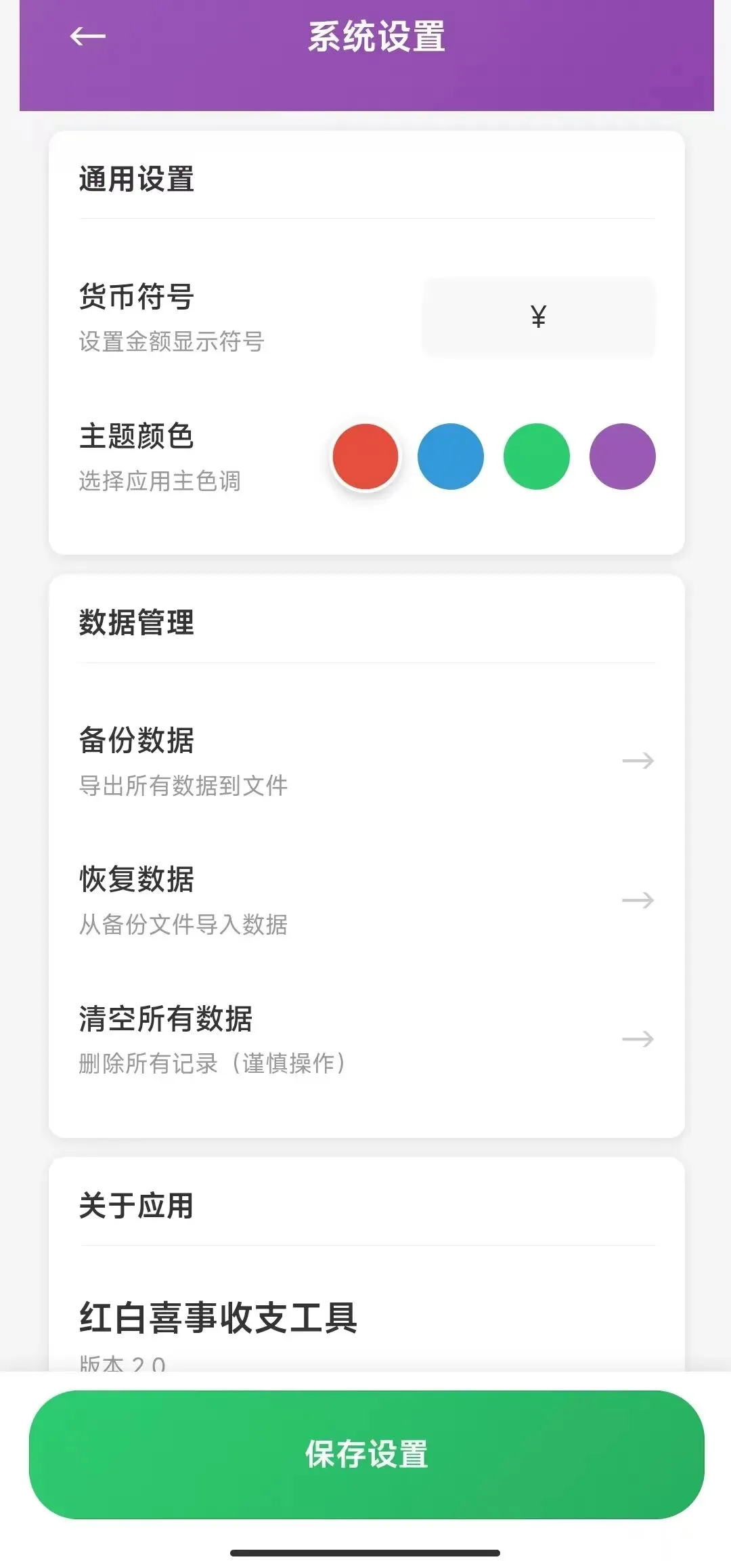 在系统设置里我们可以设置主题颜色、数据管理、备份数据、恢复数据等等,也可以导出数据,导出时可选择CSV格式,也可以选择文本文件。