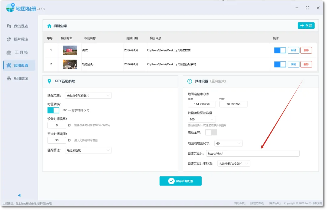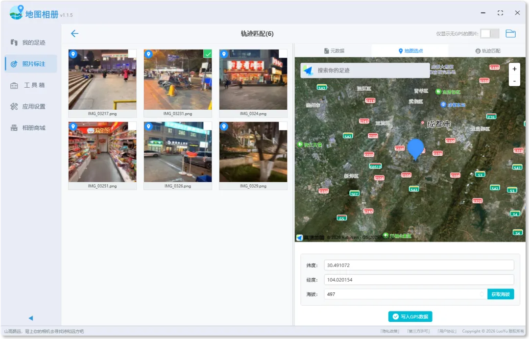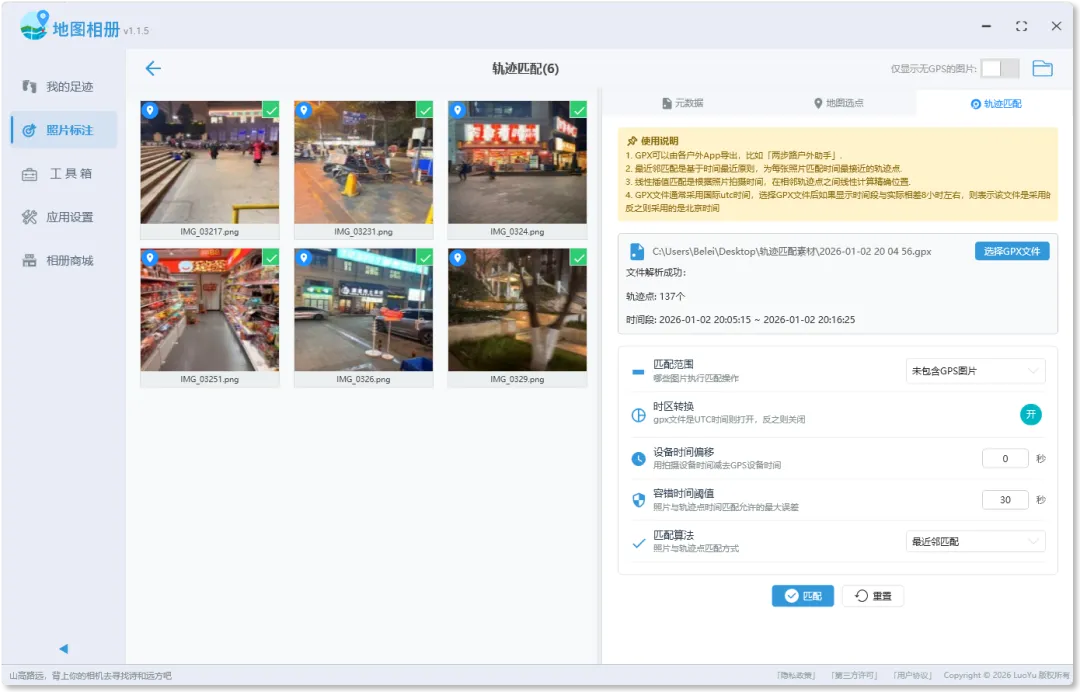 另外,如果有照片和GPX轨迹信息文件,就可以在轨迹匹配中给没有经纬度的照片匹配到经纬度信息,相当的方便快捷。