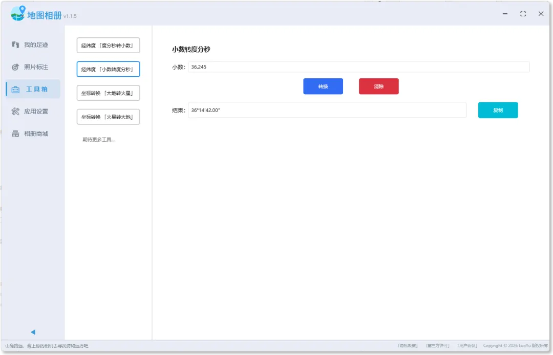 地图相册还具有经纬度格式转换、坐标转换的功能。例如将小数形式的经纬度转换为度分秒的形式。