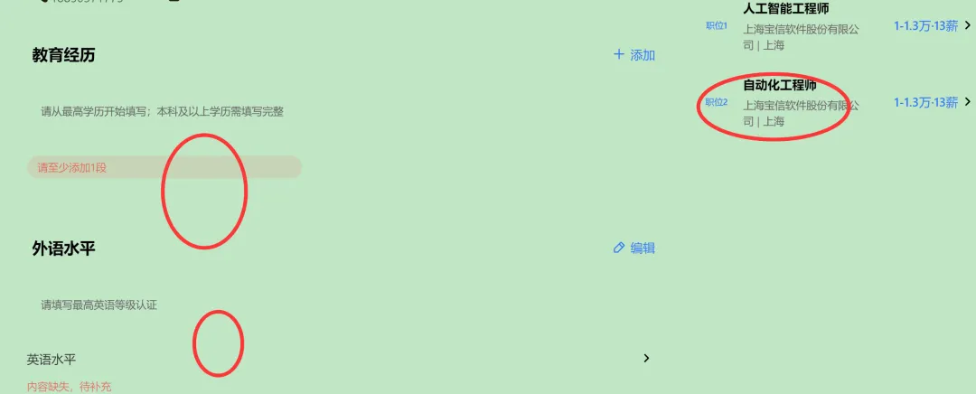 3、填写左侧简历信息(红色为必填,但建议应填尽填,如职业资格证书、四六级、计算机等级、实习经历等),选择右侧岗位,最多选2个