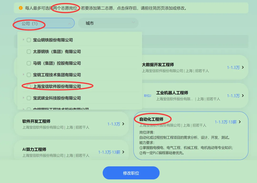 4、点击公司,选择子公司宝信软件,可以修改岗位