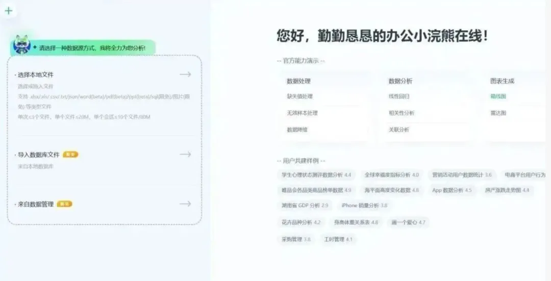 这个是专门针对Excel小白设计的。比如你有一张全年级的考勤统计表,想把迟到超过3次的学生标红并画个环形图,直接输入这句话,它会先处理数据再出图,一步到位。支持常见的.xls、.xlsx、.csv格式,最大能处理30M的文件。