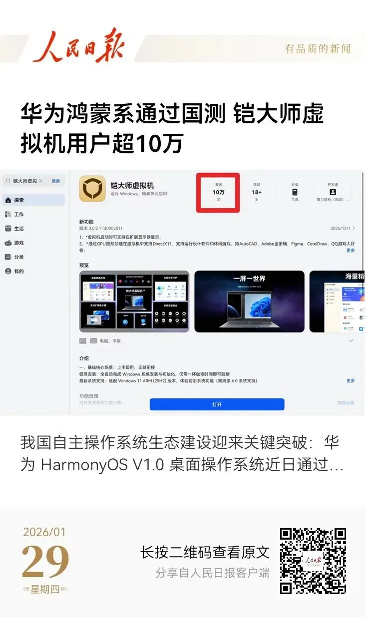 人民日报报道鸿蒙生态再添里程碑:系统获国测Ⅱ级最高认证,铠大师虚拟机用户突破10万