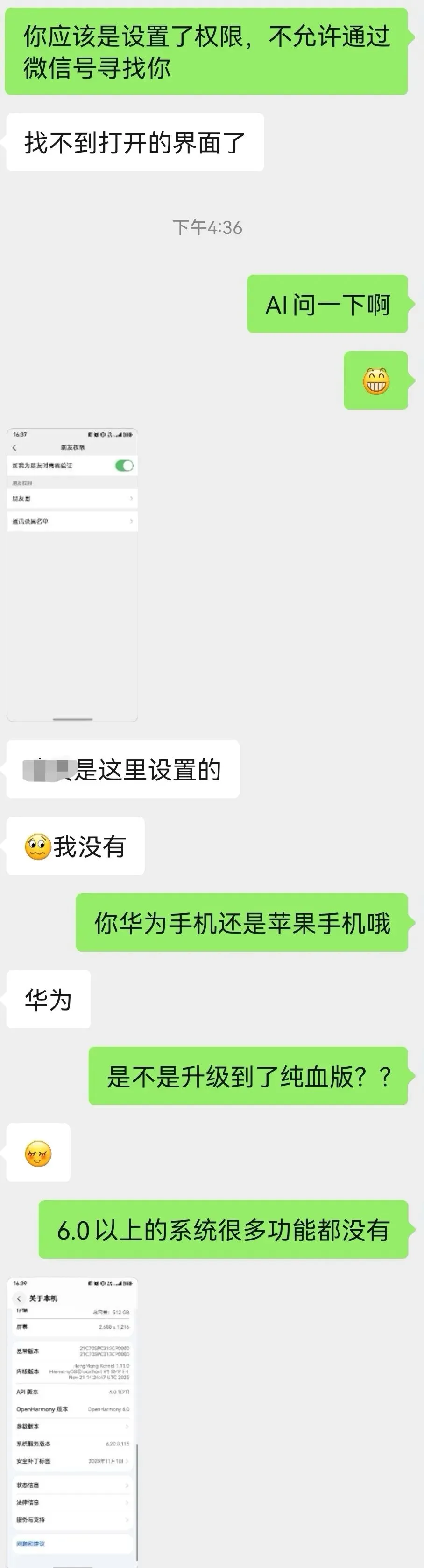 今天同事发现通过微信号添加不了他的微信,应该是限制了不允许通过微信号添加好友,想去找到这个开关重新设置一下,这下直接破大防,他的微信朋友权限设置页面跟我们的完全不一样,他说他是华为手机后,我就秒懂了,这是我的来时路啊,升级到6.0后,有些功能没有再正常不过了。