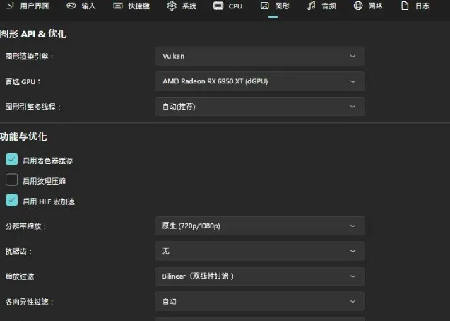 根据自己显卡性能可以启动着色缓存、启动HLE鸿加速