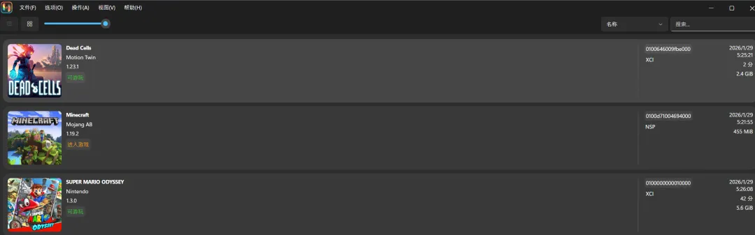 以后下载好的XCI或者NSP游戏本体拖入该文件夹模拟器自动识别显示