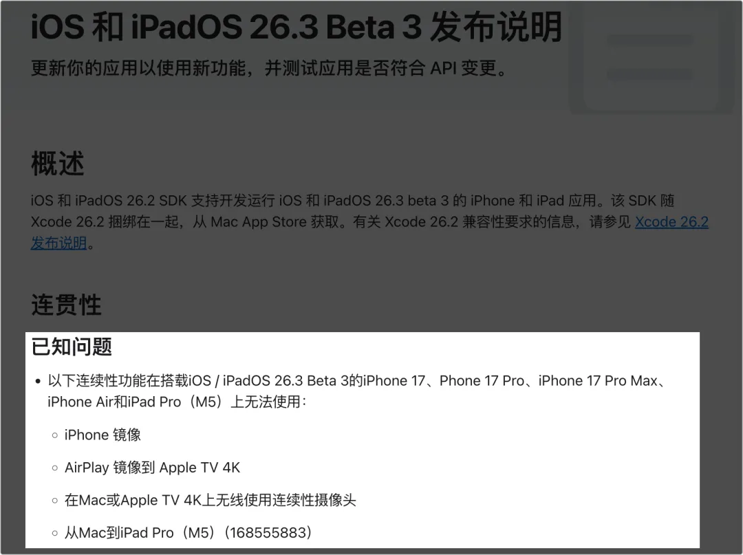 本周二,苹果推送了多个系统更新,包括 iOS26.3 Beta3、iOS 18.7.4、iOS 16.7.13、iOS 15.8.6 以及 iOS 12.5.8。苹果在更新页面表示,iOS26.3 Beta3 存在一些严重问题,包括- 无法在 Mac 和 Apple TV 调用无线摄像头