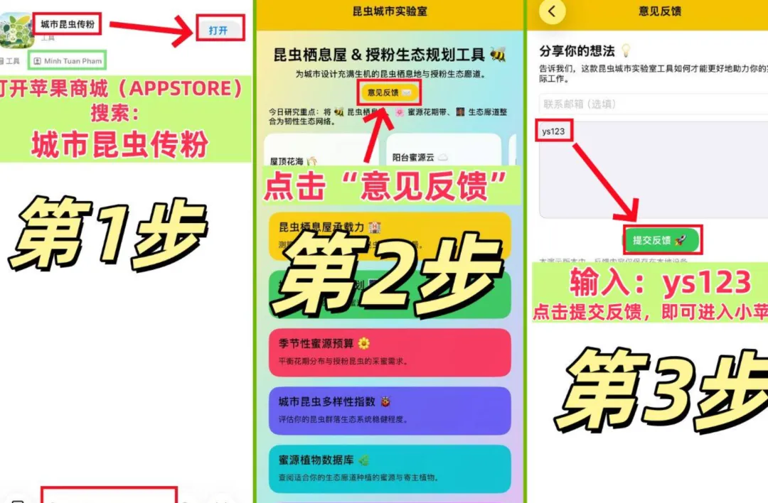 1.在【问题反馈】中输入“ys123”并提交反馈,显示“提交成功”即可进入小苹果。
