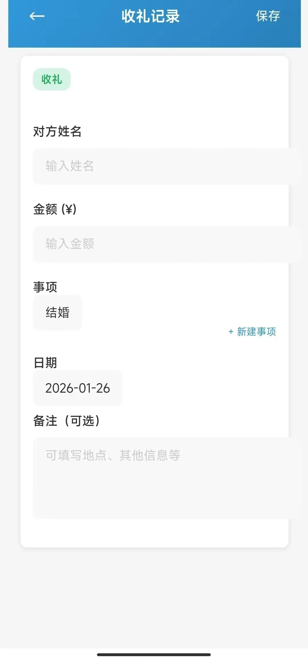 - 随礼:谁家酒、随多少、回没回,一眼可查。