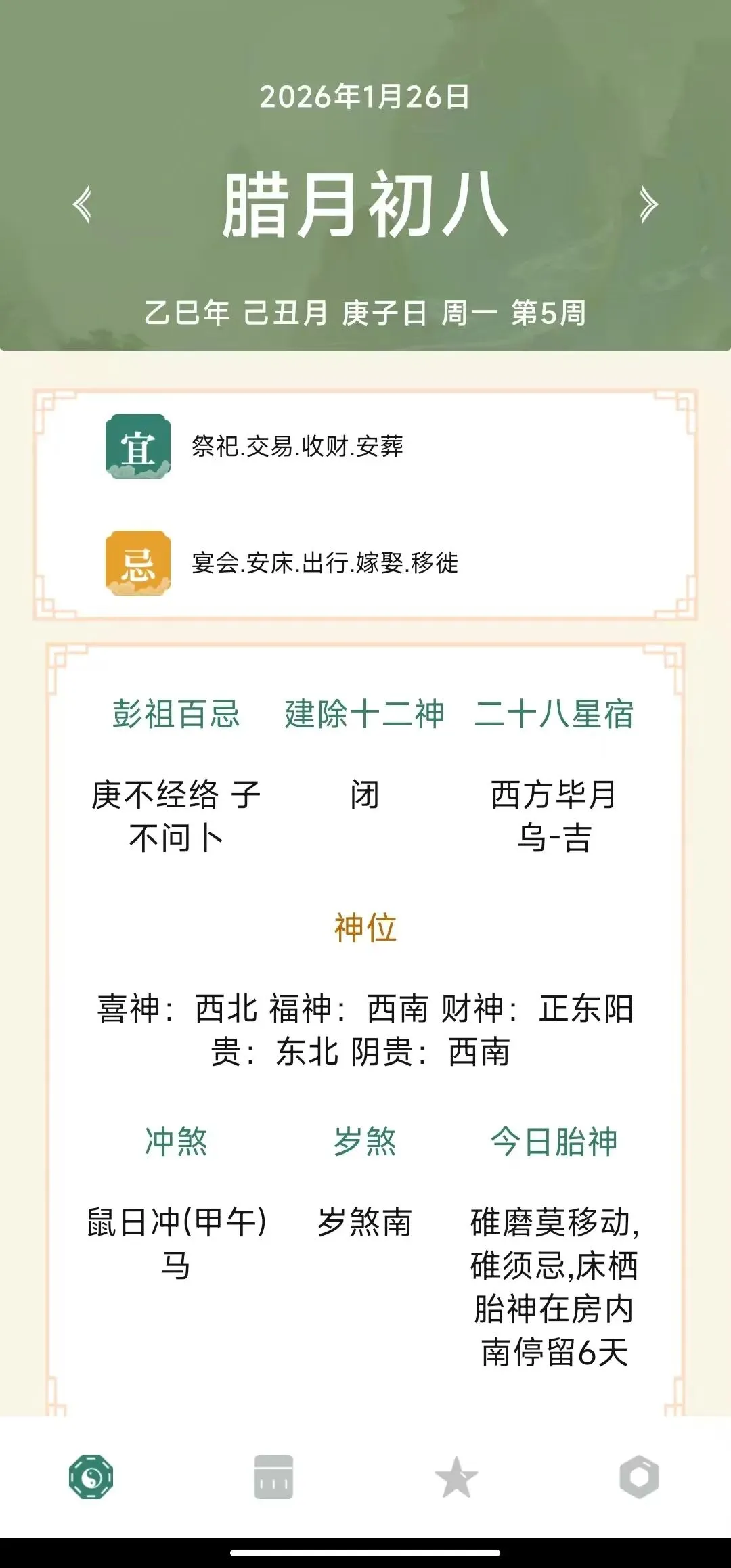 一寸、二寸、四六级、教资、签证、自定义尺寸全齐;进编辑区背景色随便换,AI抠图边缘比我手剪还细。唯一要求:联网跑算法。拍完秒出高清排版照,冲印店直接甩过去,省下的奶茶钱记得请我。第三款:免费老黄历专业版(安卓)中国人仪式感有多强?搬家先查“宜入宅”,订婚必看“良辰吉时”。这款老黄历界面比爸妈买的挂历还清爽,提供时辰、冲煞、彭祖百忌,还能一键跳转到农历、节气。