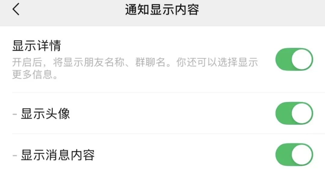 被灰度覆盖的果粉们,可在微信通知设置中看到焕新的独立开关样式,开启“显示详情”后,将出现“显示头像”和“显示消息内容”两个独立按钮。