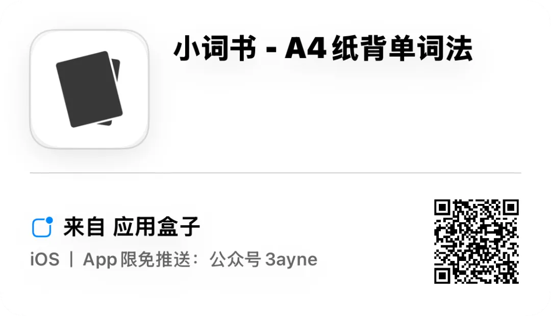 应用介绍:小词书采用经典A4纸背单词法,结合滑动记忆+艾宾浩斯科学间隔复习,让你高效记住单词!无任何广告、页面极简,带来最纯粹的沉浸式背单词体验。专注学习,不被打扰。适合考研、四六级、托福、雅思等英语背词需求。
