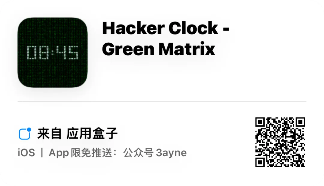 应用介绍:黑客时钟将您的iPhone变成一个真正独特的时钟,显示为动画十六进制代码。 绿色十六进制值在屏幕上不断移动,使它看起来像是您的手机在处理复杂的数据。 此应用程序非常适合计算机极客、黑客和矩阵迷。 如果你使用的是二进制时钟,你可以把它扔掉。 一旦你尝试了这个十六进制时钟,你就再也不想用任何其他时钟了。