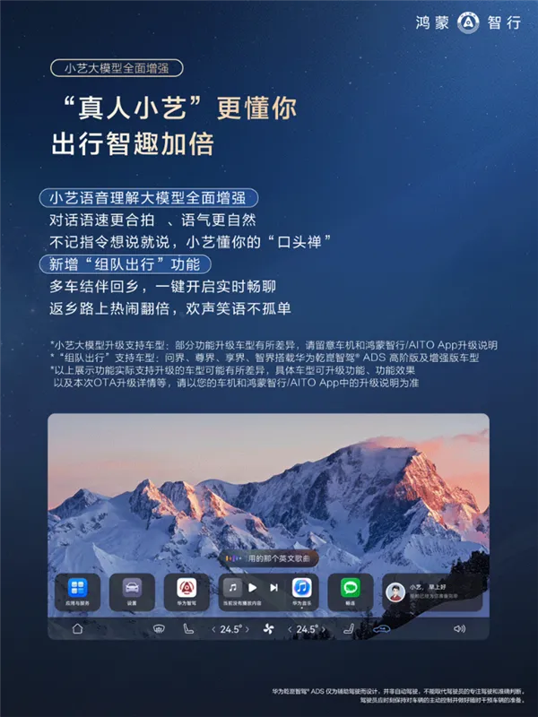 智能座舱方面,小艺大模型迎来明显进化。升级后,小艺在语速、语气和表达节奏上更加贴近自然交流,减少机械感,使人机对话更加顺畅、舒适。随着大模型能力的持续释放,车内语音交互正从“指令式控制”向“陪伴式交互”转变,提升日常用车过程中的情绪价值。多车组队上线,车与车之间真正“连起来”