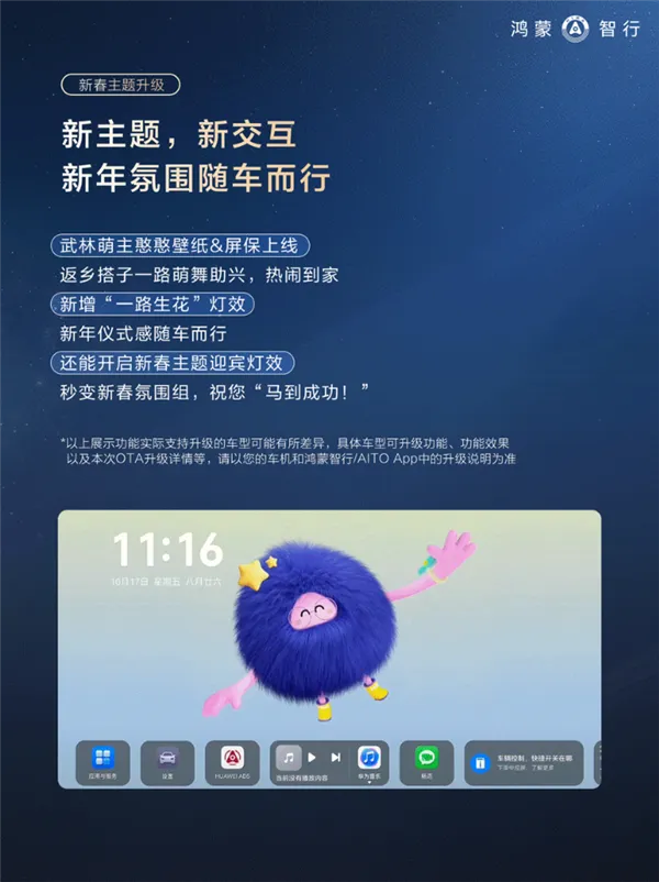 配合春节节点,鸿蒙智行同步上线新春主题内容,包括“武林萌主”主题壁纸、“一路生花”专属灯效以及定制迎宾灯语。在功能升级之外,通过视觉与交互细节的变化,为用户营造更强的节日氛围,增强人与车之间的情感连接。高频功能持续优化,日常体验更顺手