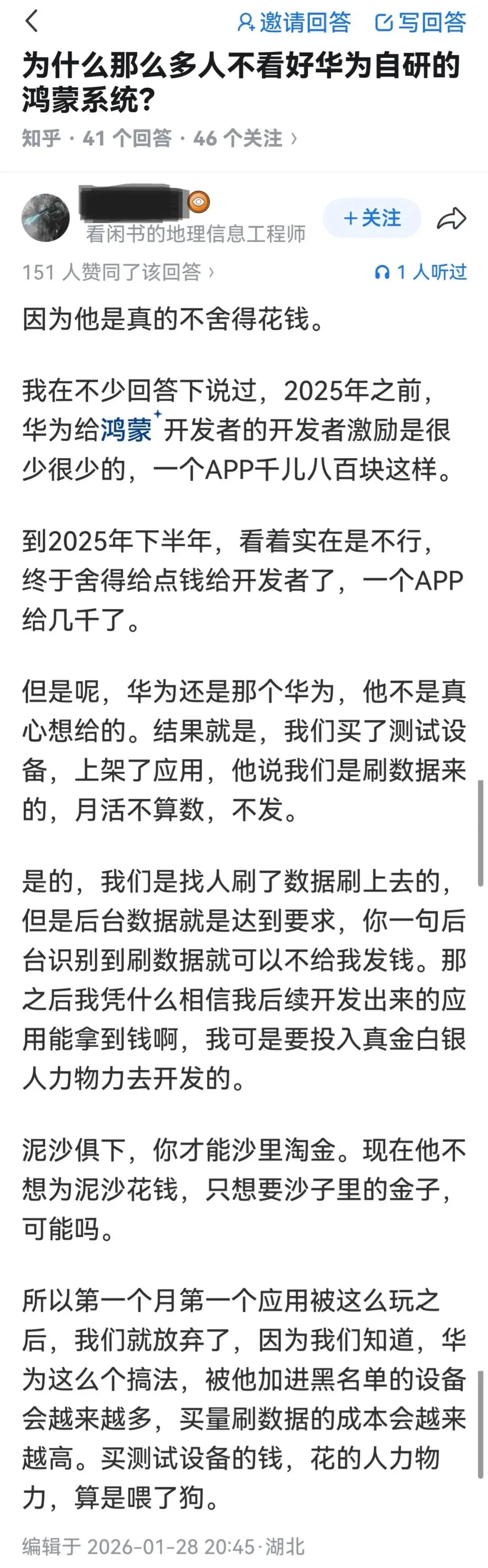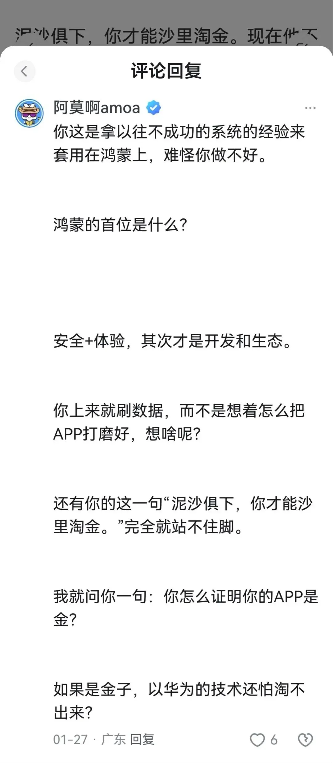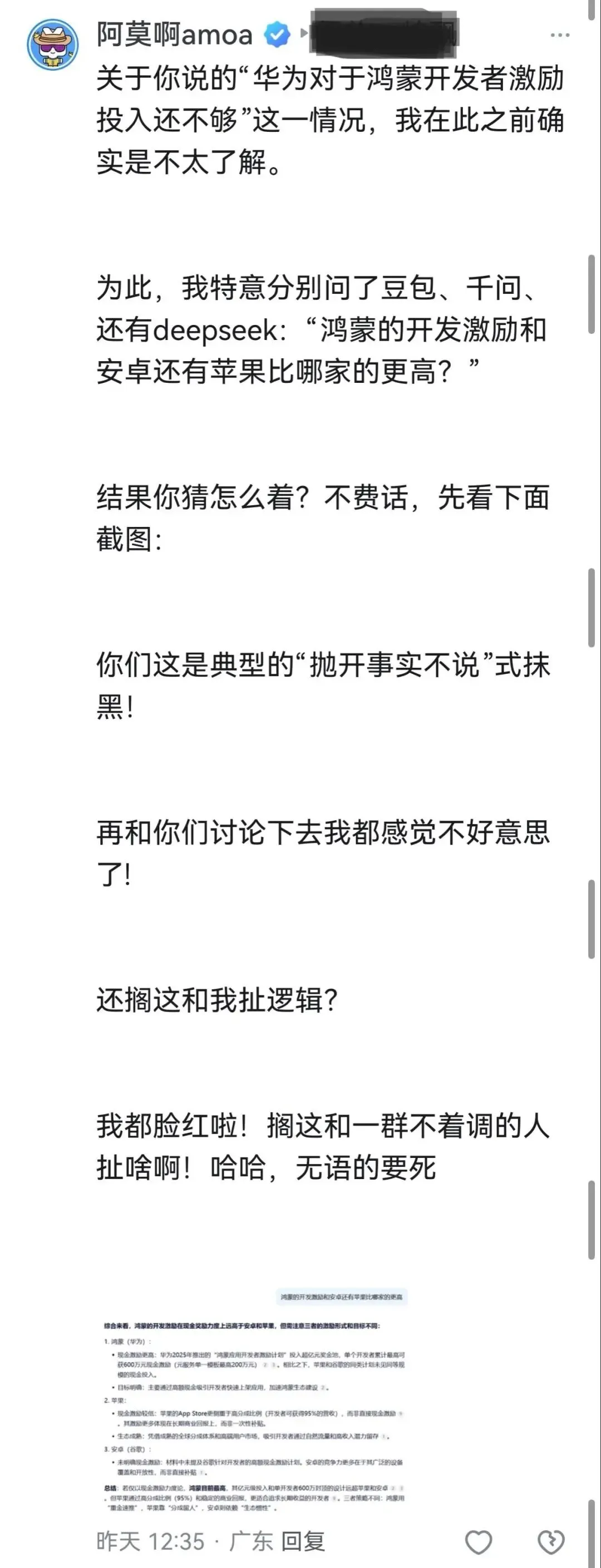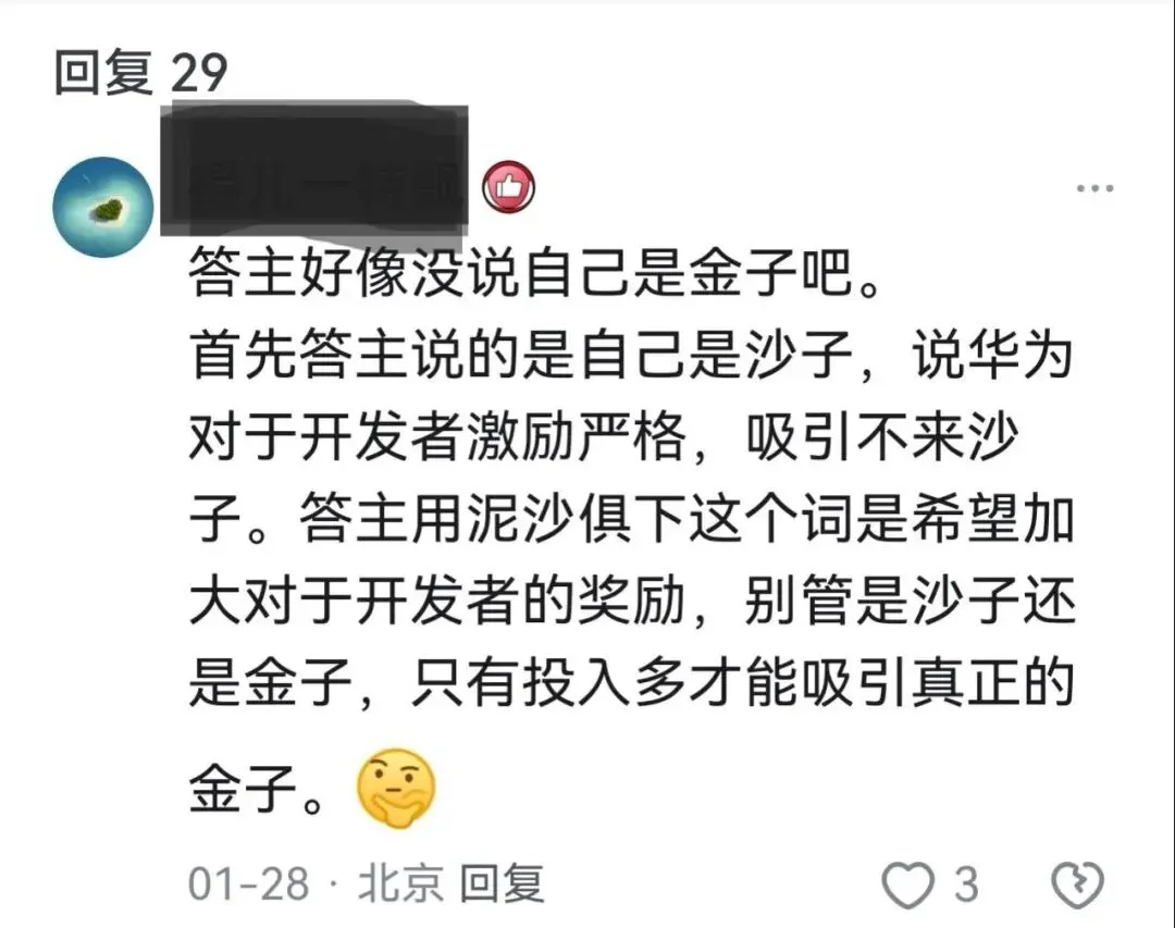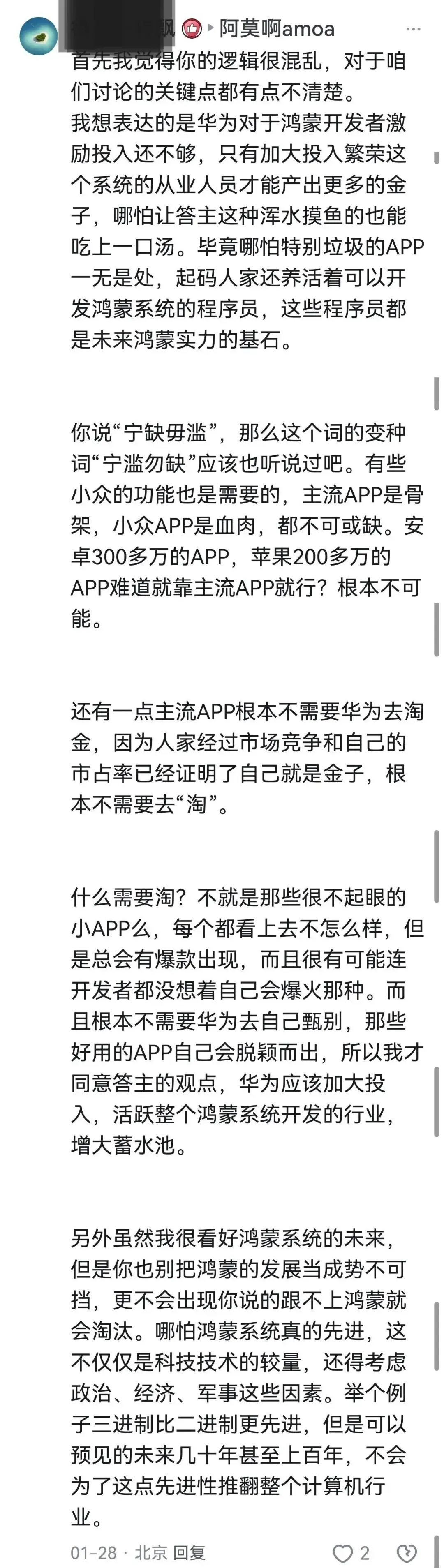 不过我根本就不打算被他带着走。而是借力使力,准备从他说的所谓重点“华为对于鸿蒙开发者激励投入还不够”作为突破点,要给他来一记狠狠的回头枪。
