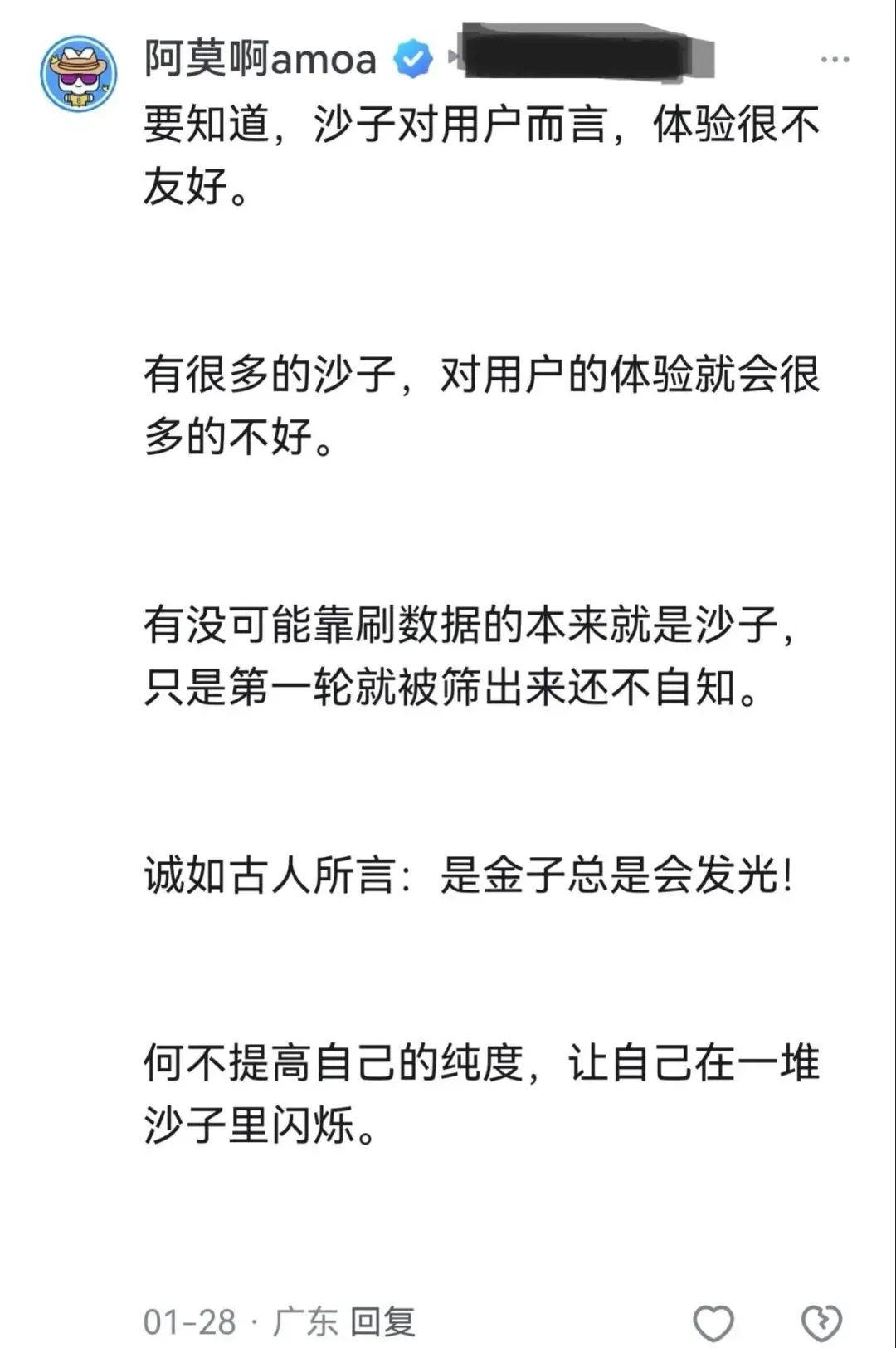 看完感觉有点不对劲了,他是绝口不提“刷数据”作弊的事,只一味的用"泥沙俱下"这一诡论作反驳,还用“小池塘养不出大量的大鱼。”来巩固他的观点。