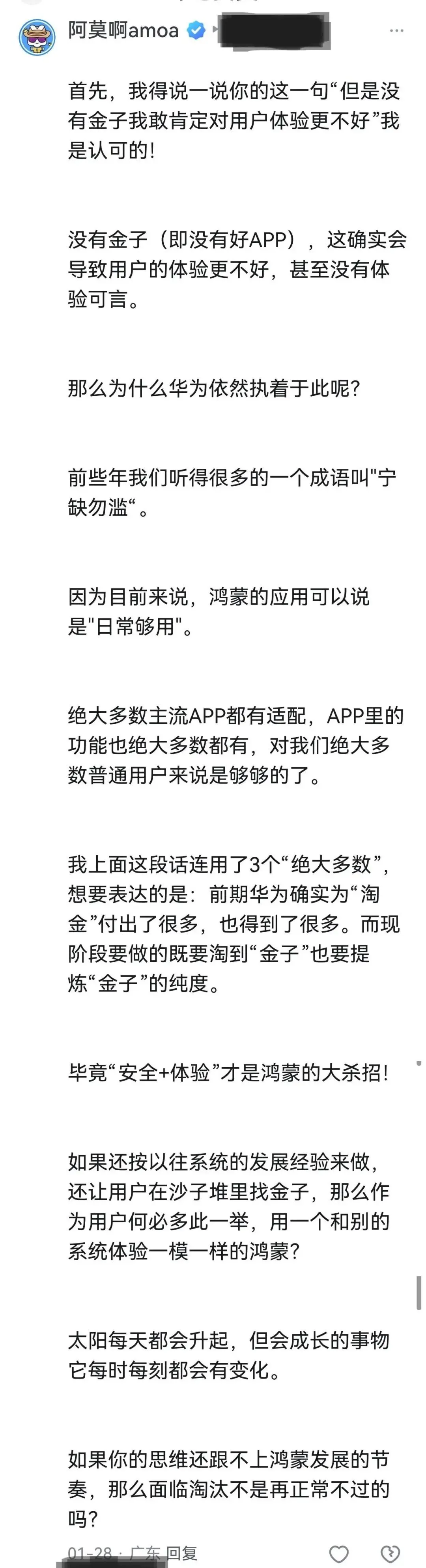 我首先对他的其中一个观点表达了认可,为了避免被他带着走,我转换了一个方向,用宁缺勿滥的安全+体验作为切入点进行论证,来说明为什么鸿蒙要走和以系统不同的路线。