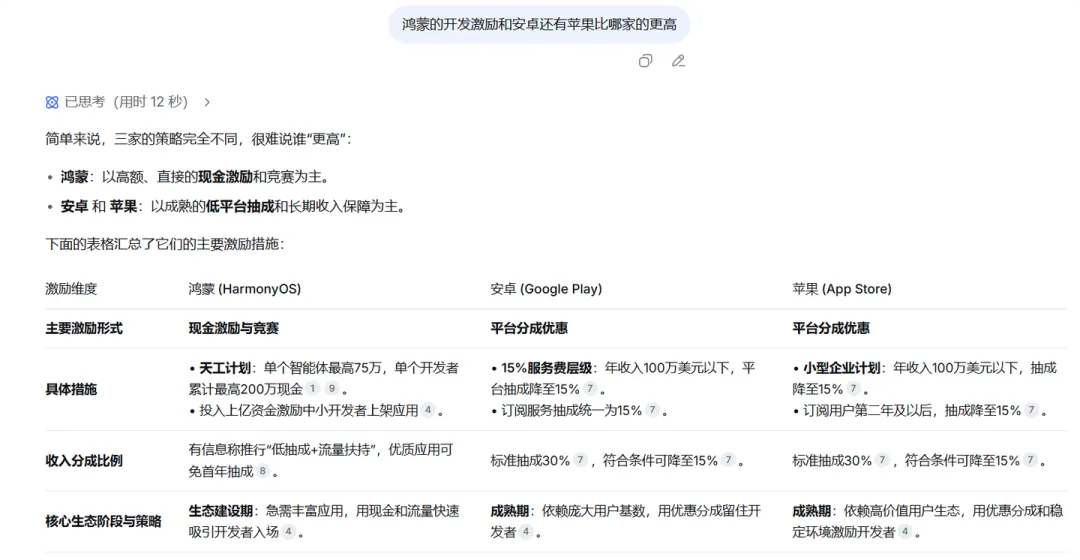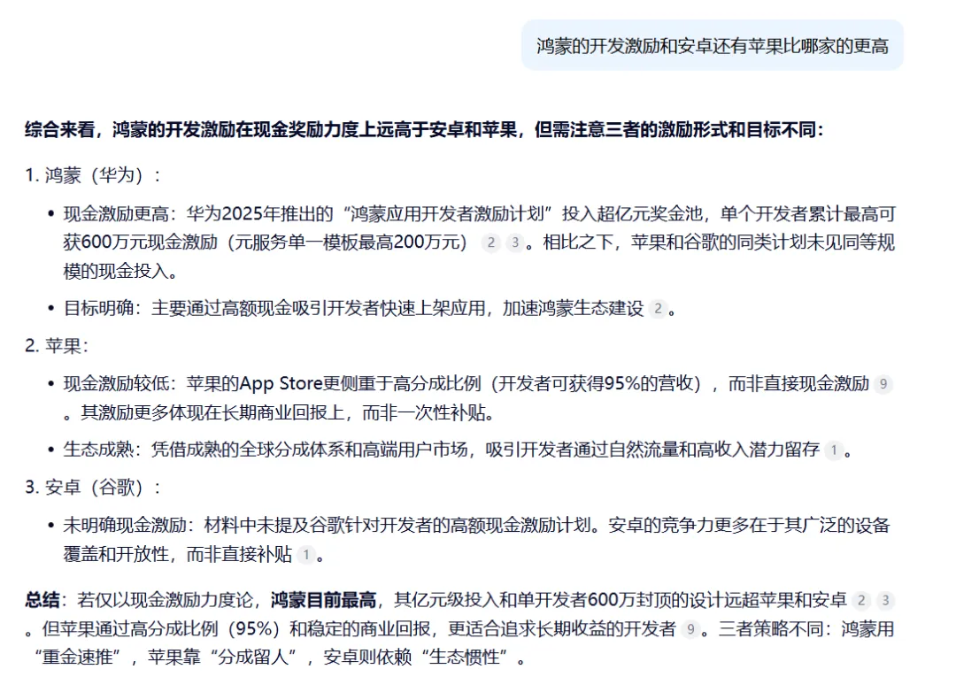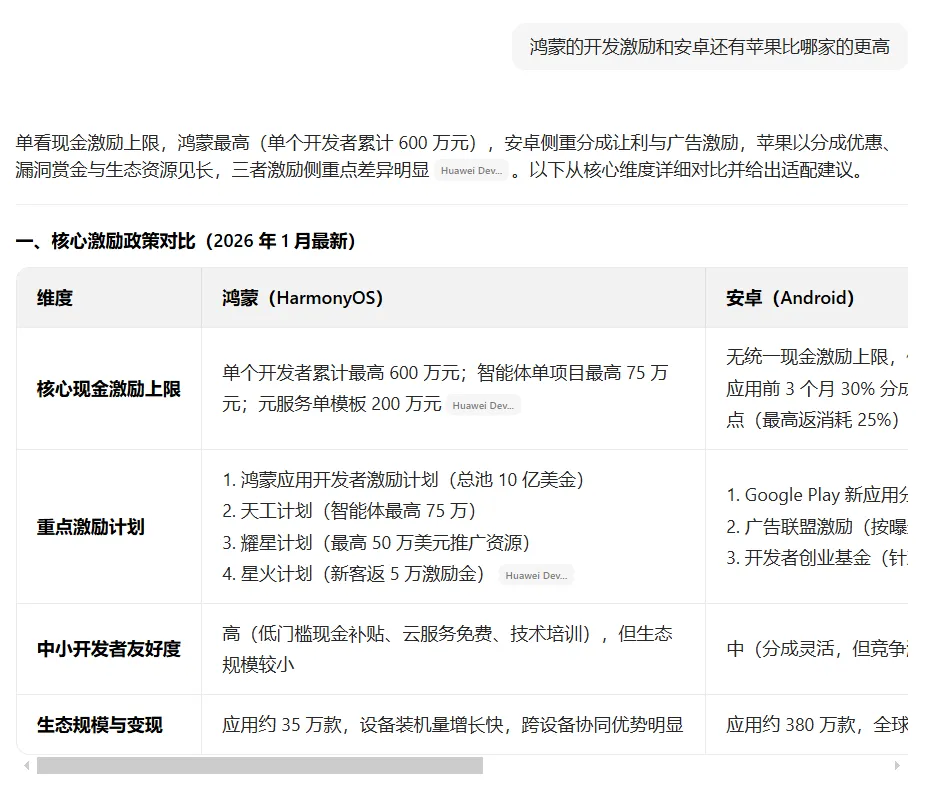 于是我打开豆包问“鸿蒙的开发激励和安卓还有苹果比哪家的更高?”