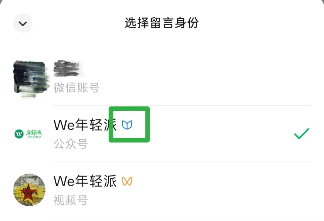 除了微信主页面图标变化之外,微信留言多身份选择时,公众号名称后侧也增加了相应图标,此处之前是没有图标的。