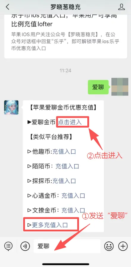 苹果iOS爱聊金币优惠充值,关注微信公众号【罗晓葱稳充】在对话框中回复关键词“爱聊”,公众号将自动推送爱聊金币优惠充值入口。
