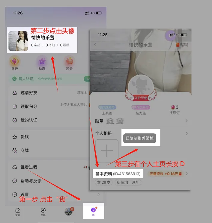2、在个人主页长按基本资料旁的ID即可进行复制