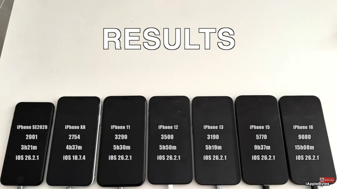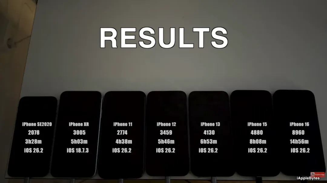 从油管数码博主iAppleBytes分享的iOS 26.2.1正式版续航测试来看,大部分iPhone机型在升级后续航都获得了提升,仅iPhone 13续航出现断崖式下跌。
